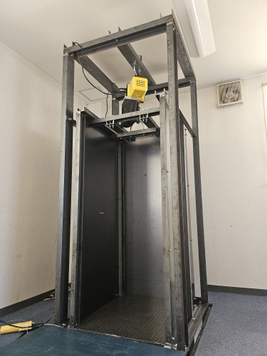 移動組立式チェーンブロック用架台パーツと移動組立式垂直搬送機用かご用パーツを組み合わせた製品です。